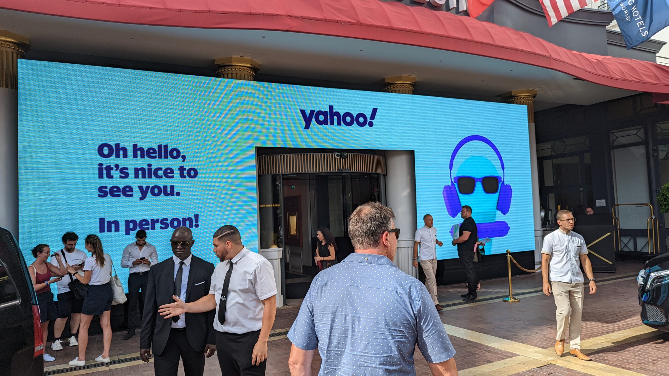 promote Yahoo occupying the space within Hotel Martinez and welcoming those joining various panel sessions and parties they were hosting. Yahoo could have easily opted for a vinyl banner. Still, they chose to go the extra mile and engage anyone entering Hotel Martinez with a powerful message using this powerful and unmissable DOOH screen."