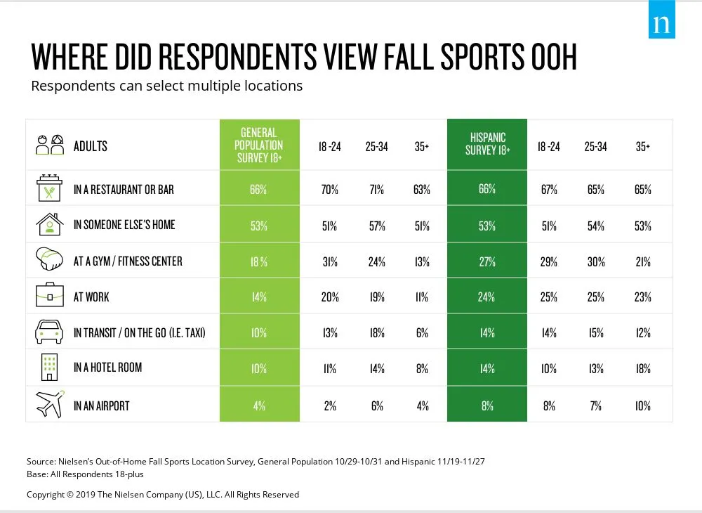 analysis conducted by Nielsen found viewers watching fall sports, including MLB World Series, MLS, NBA, NCAA Football and NFL programming, outside of their homes, particularly in restaurants/bars or other homes. While 66% of adults watch in restaurants/bars, only 20%-30% exclusively do so. This highlights the widespread appeal and diverse viewing preferences associated with fall sports.