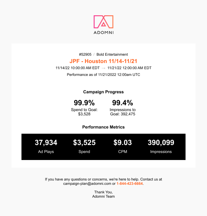 Campaign performance reports provide an overview of the campaign’s budget spend, impressions delivered, ad plays and CPM. The data in this report allows advertisers to monitor the health of their campaigns in real time.