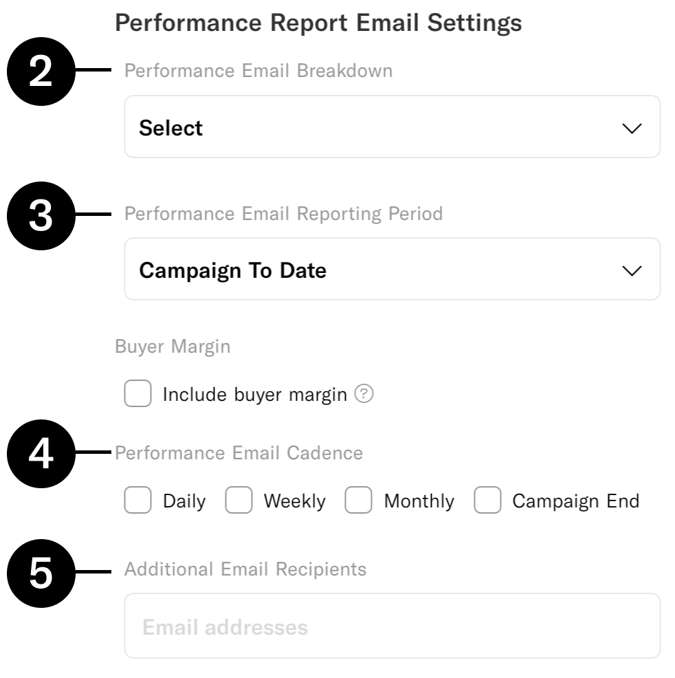 - Choose the frequency that you'd like to receive emails from Performance Email Cadence. If weekly, choose a day of the week.